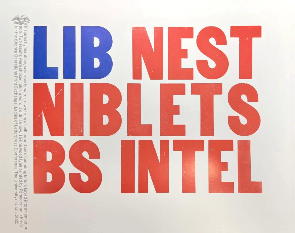 Colophon: Inspired by Scrabble, seven sorts were drawn from a hellbox and corresponding letters keyed into an anagram app. Two results were chosen, plus a word it didn’t know. 15-line wood type printed by Fameorshame Press for the Chance Operations Print Exchange, Ladies of Letterpress Conference, The University of Utah, 2025.